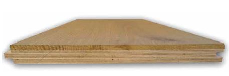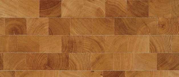 planche plate. Les blocs ont été coupés transversalement par rapport au veines du bois ce qui fait que les cernes de croissance sont visibles à la surface. Ceci fait de ce parquet un revêtement de sol résistant à la pression et à l’usure qui est donc idéal pour un usage industriel.
