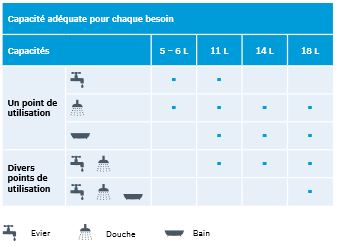 Ainsi, comme l'illustration ci-dessous, si vous voulez consommer de l'eau chaude dans la douche et dans la cuisine simultanément, nous vous recommandons une capacité de 11 litre minimum pour plus de confort.