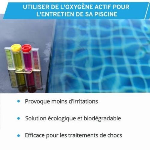 Enfin, on peut traiter sa piscine à l’oxygène actif, qui se présente sous forme de peroxyde d’hydrogène. Ce produit est redoutable face aux microorganismes et aux algues, et il présente l’intérêt d’être écologique et de ne pas irriter la peau, les yeux et les muqueuses. En revanche, il présente un faible pouvoir rémanent qui vous oblige à l’associer à un stabilisant. De plus, il est plus efficace dans les petits bassins.